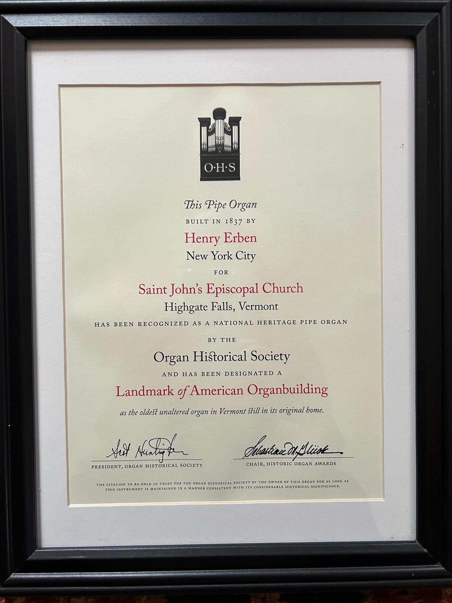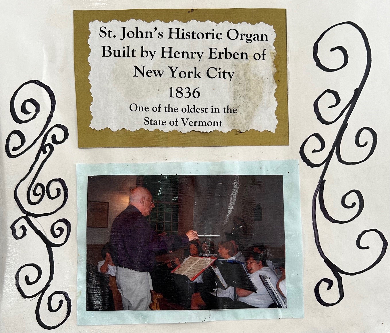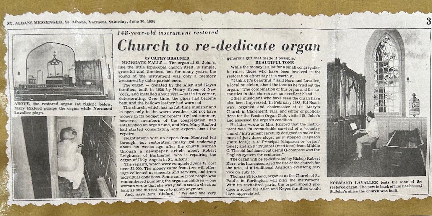 The organ was built by Henry Erben of New York City in 1836. It has the distinction of being the oldest unaltered pipe organ in Vermont in its original location. It was designed to make the most of just three stops: an 8' Stopped Diapason, a 4' Principal, and an 8' Trumpet. Using the organ requires an assistant to hand pump the lever that operates the bellows, to the delight of younger members of the parish who often do the pumping.
