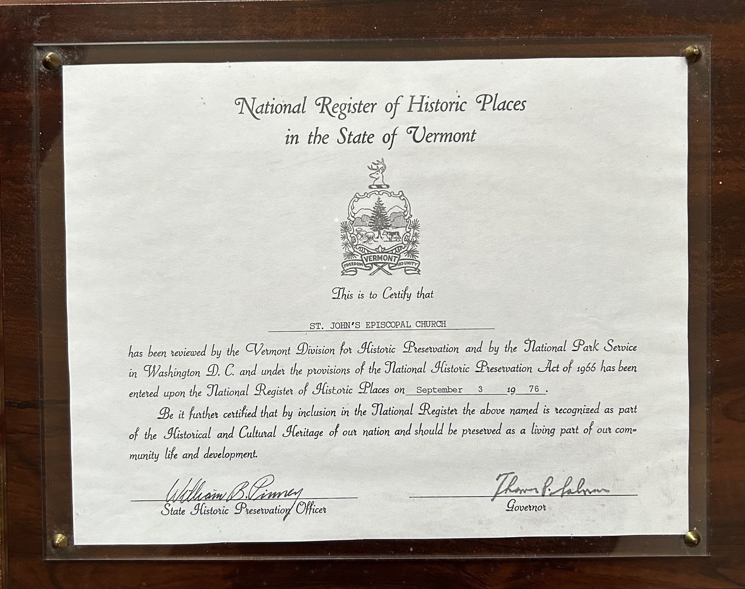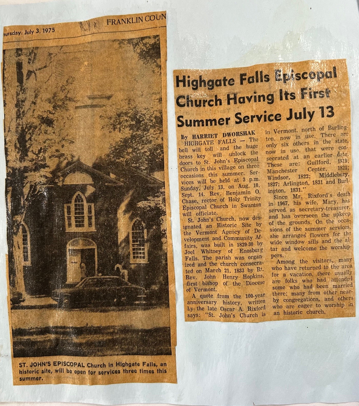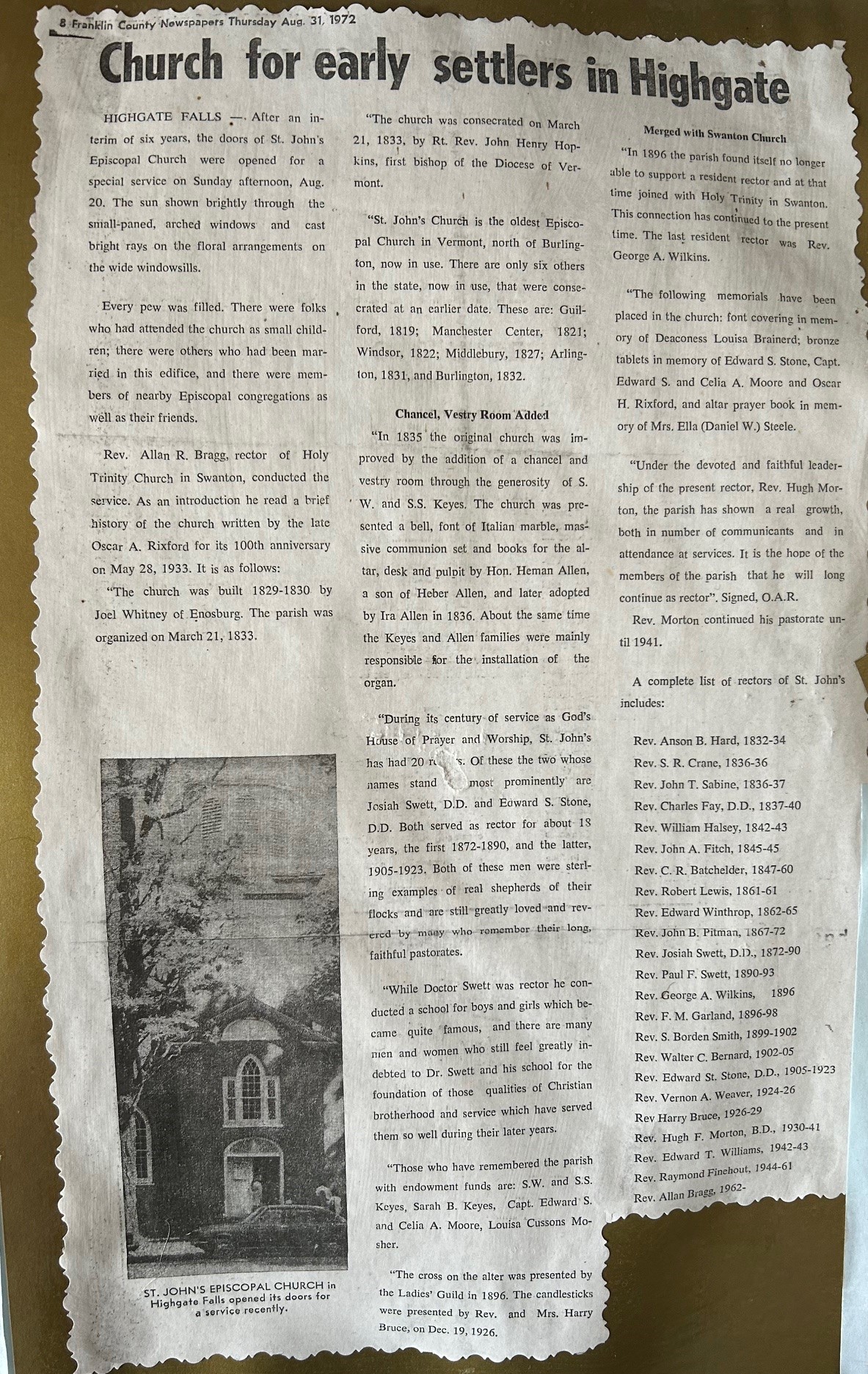 St. John's Church was built in 1829-1830 by Joel Whitney of Enosburg. In 1835, the chancel and vestry room were added through the generosity of S. W. and S. S. Keys. In 1836, the church was presented with a bell, a font of Italian marble, a silver communion service and books for the altar, and